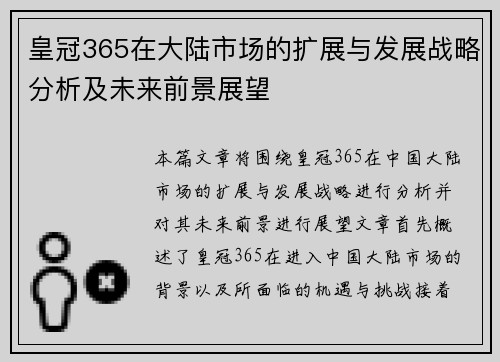皇冠365在大陆市场的扩展与发展战略分析及未来前景展望